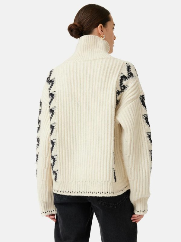Designed for the mountains and every other landscape, this jumper embodies elevated alpine elegance. Revel in the crisp allure of monochrome hues, enlivened by intricate jacquard patterns and meticulous hand-stitching details. The generous turtleneck not only exudes style but ensures unparalleled warmth, embracing both fashion and function for your winter adventures.Fit and Features