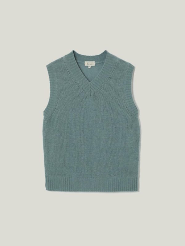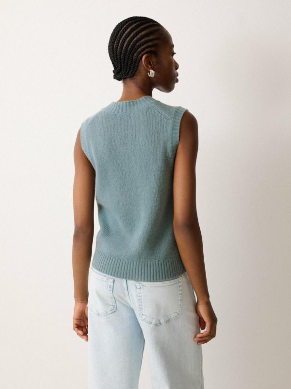 This sleeveless v-neck tank top is elevated with a mid-weight cashmere knitted yarn, making it the perfect transitional layer for the warmer months and beyond. Finished with modern chunky rib at the neck, hem and armholes, we love it paired with classic denim and a pair of statement shoes.