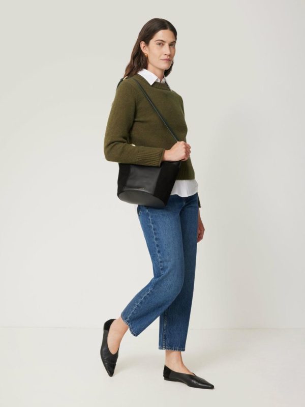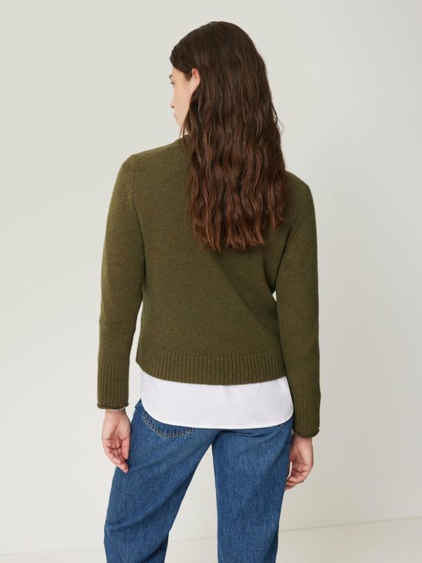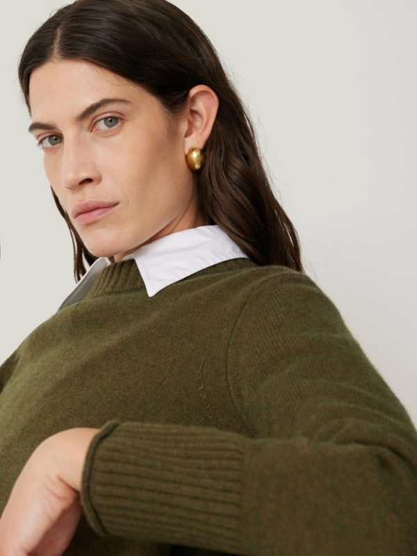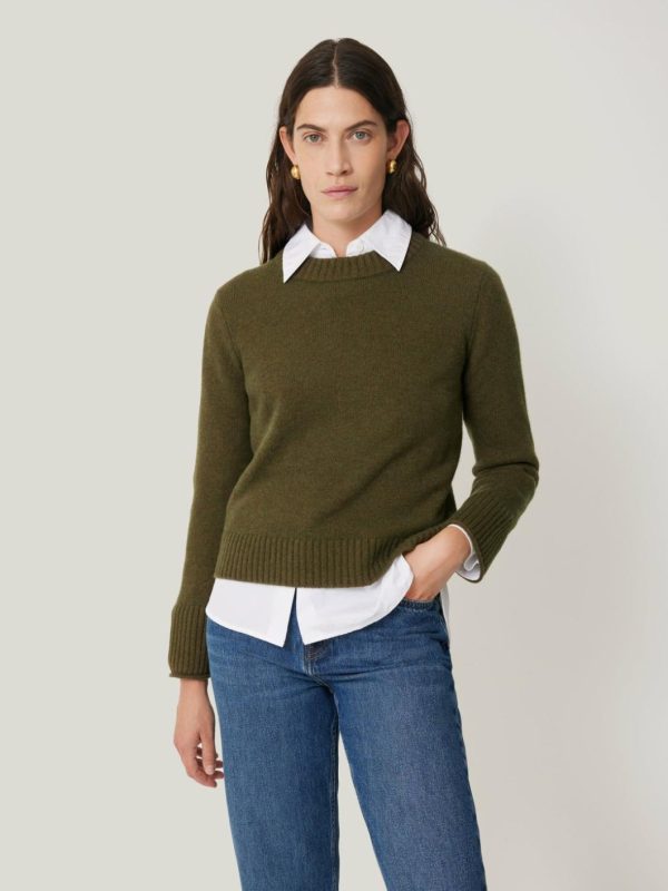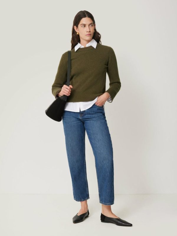 Knitted in a mid weight wool cashmere blended yarn, our crew neck jumper is designed with a shorter silhouette. Finished with modern chunky rib at neck and cuffs. Pair with denim and leather separates or layer over printed dresses. Size up for a more slouchy look.