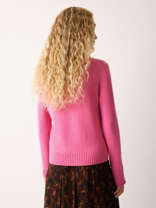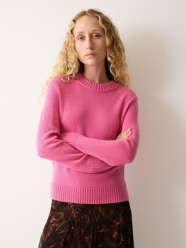 Knitted in a mid weight wool cashmere blended yarn, our crew neck jumper is designed with a shorter silhouette. Finished with modern chunky rib at neck and cuffs. Pair with denim and leather separates or layer over printed dresses. Size up for a more slouchy look.