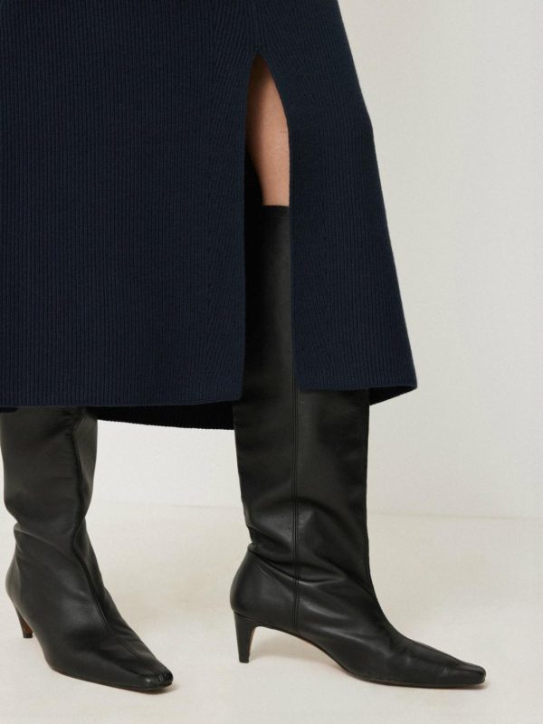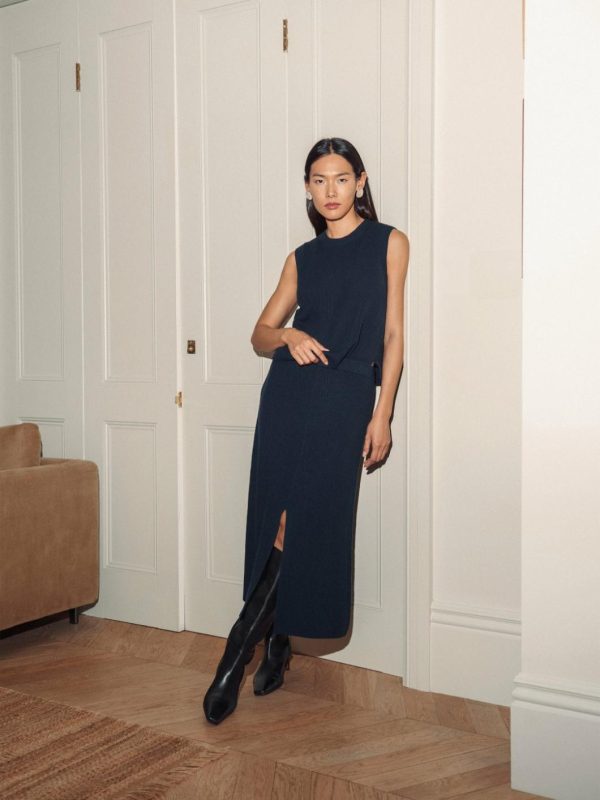 A body-skimming silhouette imagined in a sultry navy hue characterises the Cotton Blend Knitted Skirt, along with an elegant slit that can be worn at the front or back, depending on where the mood takes you. Made from a cotton blend mid-weight rib knit, the skirt can be pulled on with ease thanks to an elasticated waist that then sits flat and softly on the skin, allowing for perfect trans-seasonal comfort.