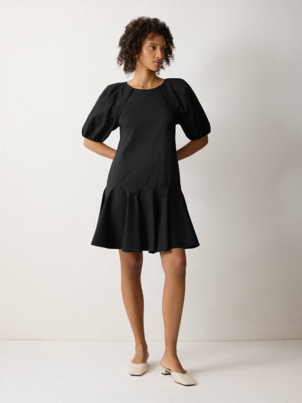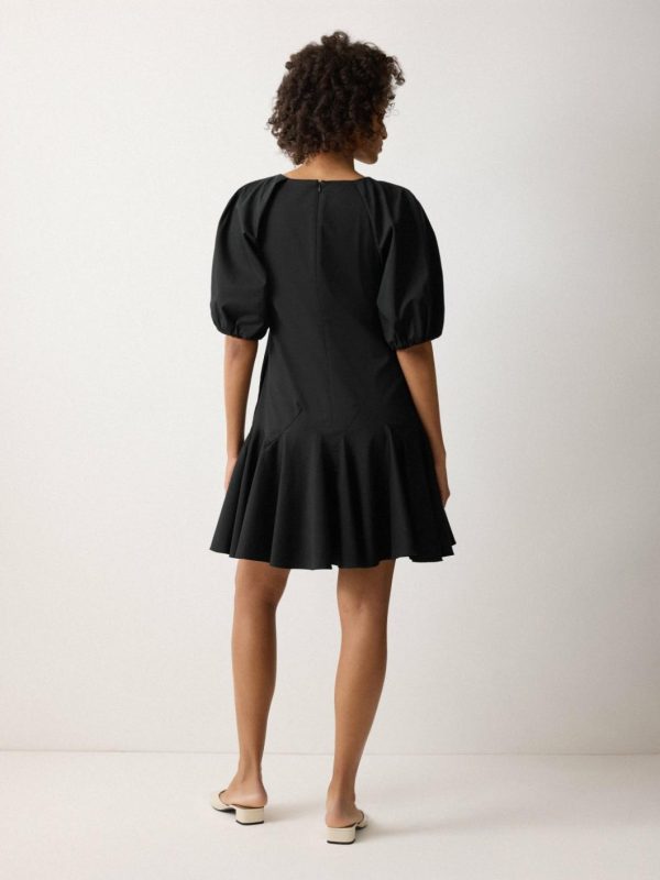 This black dress plays with proportion in all the right places. Crafted from smooth cotton poplin, voluminous balloon sleeves frame a simplistic A-line bodice which cascades into a flared single tier skirt.