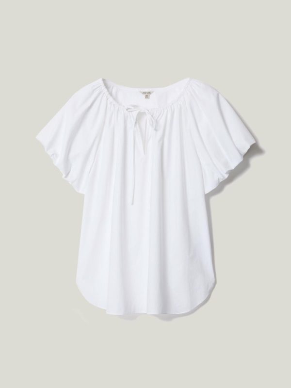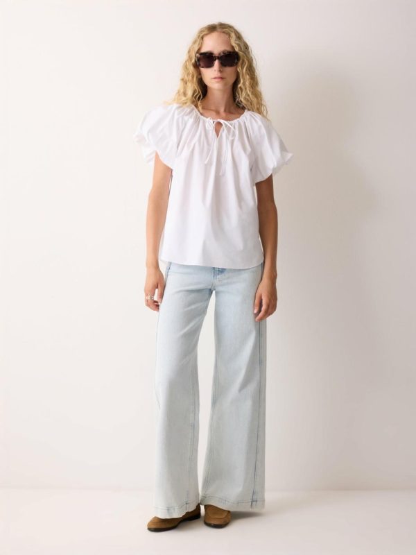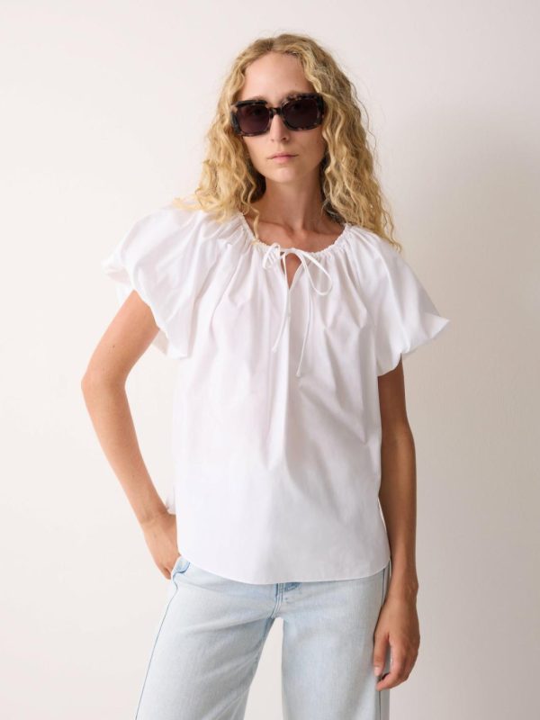 This top is the perfect everyday piece that works equally as well with denim as it does with a pair of tailored trousers. Airy in smooth, lightweight cotton, voluminous puff sleeves frame a slightly oversized silhouette, which features a front tie that you can leave loose or fasten into a bow.