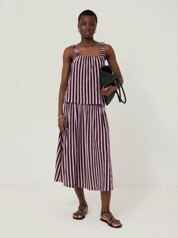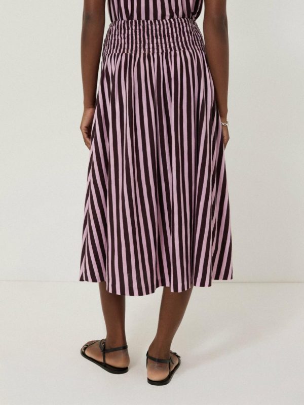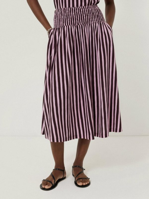 Designed as part of a playful summer two-piece, this midi skirt in cotton slub jersey is enlivened with a bold ticking stripe in key colours for the season; lilac and oxblood. A wide shirred waistband adds extra comfort which can be worn low on the waist or higher depending.