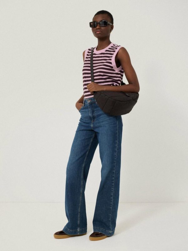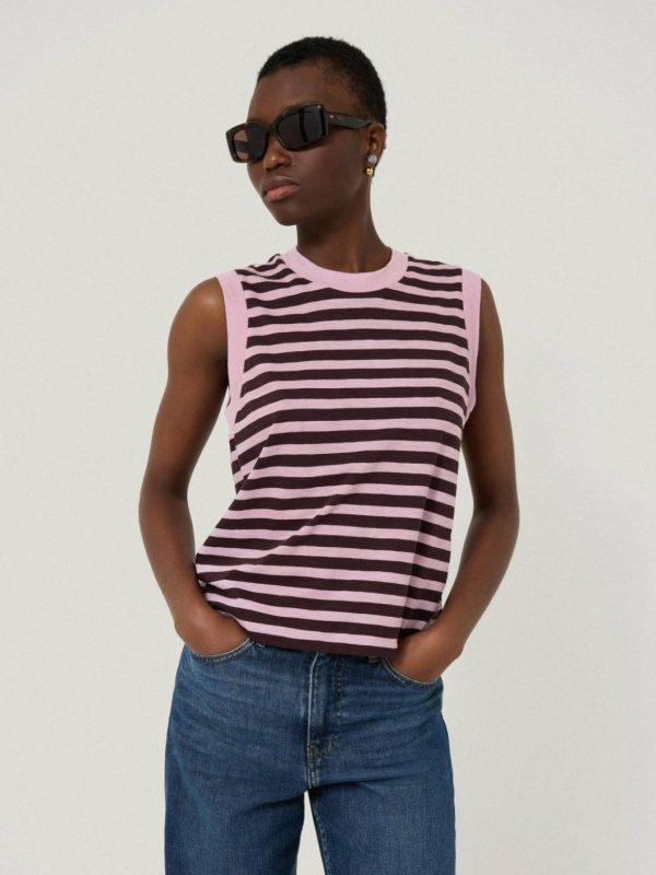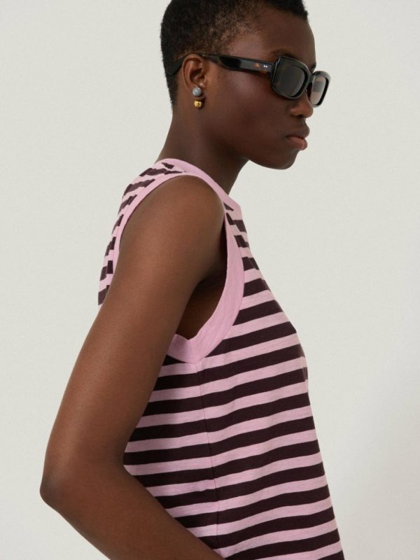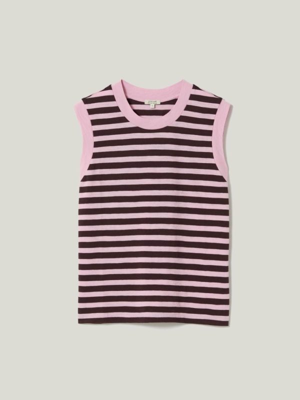 This crew neck tank top in cotton slub jersey is enlivened with a ticking stripe in key colours for the season; pink and oxblood. Wear to bring boldness to your summer basics with denim.