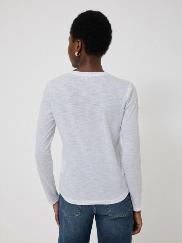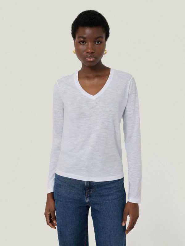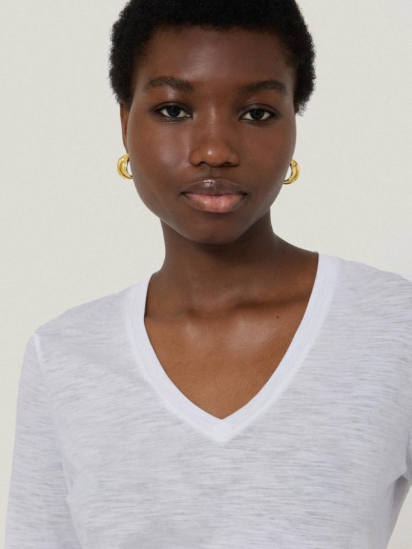Our classic 100% slub cotton jersey top is reworked for the new season with a V-neckline. This allows for streamlined layering with all our V-neck knits on cooler days, or alternative worn on its own.