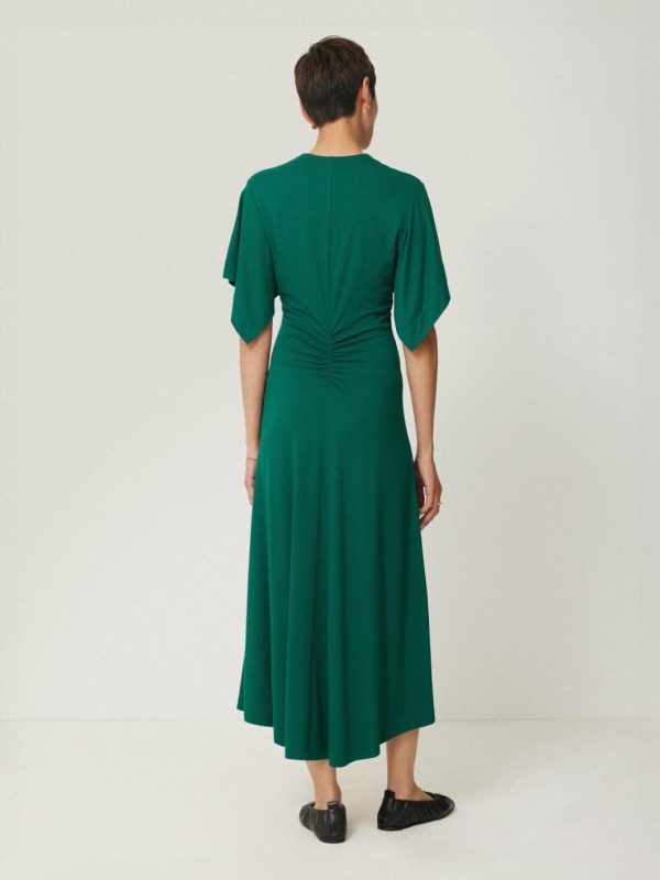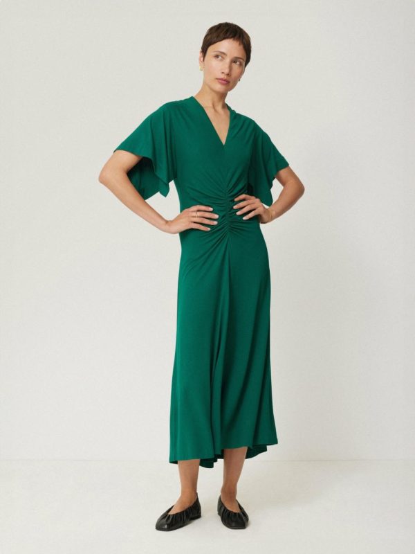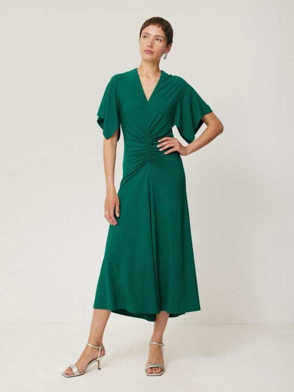 This midi dress is ready to grace your next event in a rich, emerald jewel tone. Soft jersey fabric hugs and flatters the body in all the right places, while ruched detail to the centre of the bodice and flutter sleeves frame this piece, whether worn in the day with flats or dressed up with heeled sandals.