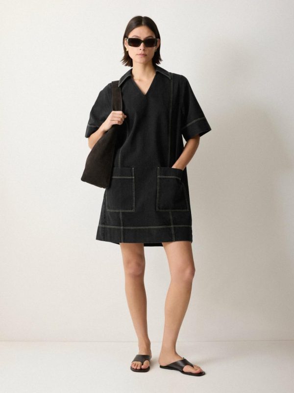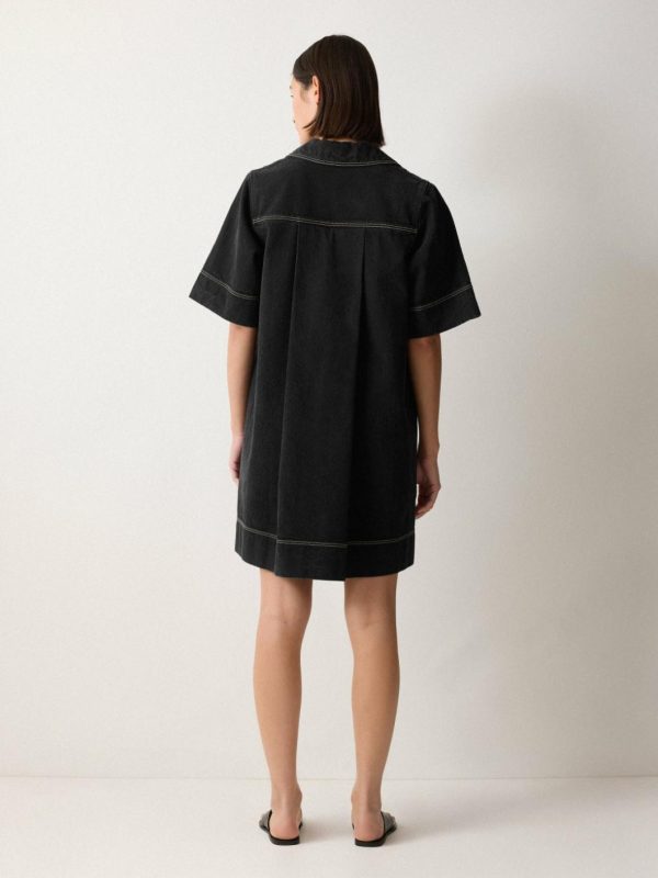 Our short sleeve shirt dress in black wash denim is the perfect pull-on design for every season. Contrast stitching adds a contemporary twist to this piece, as do oversized patch pockets.