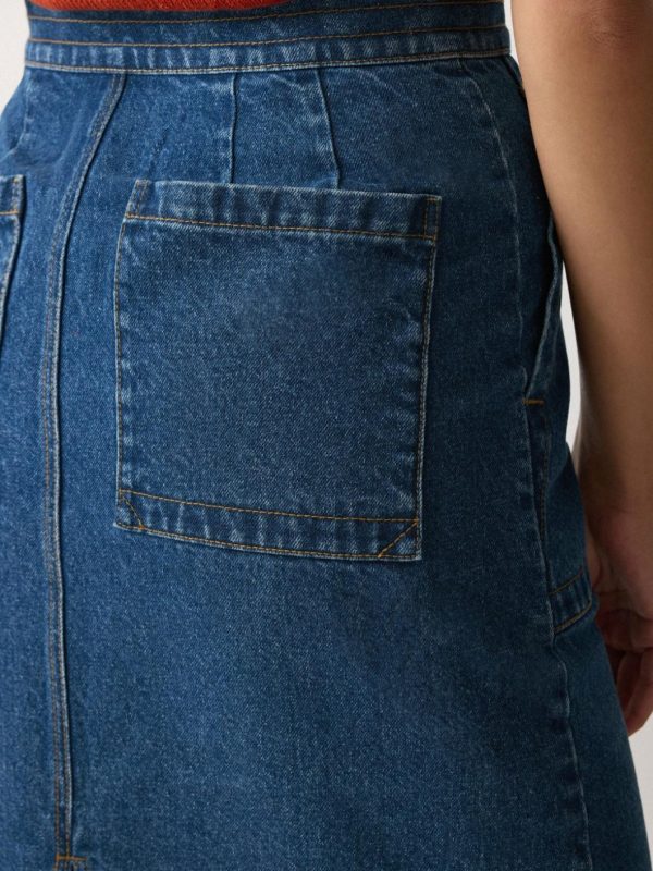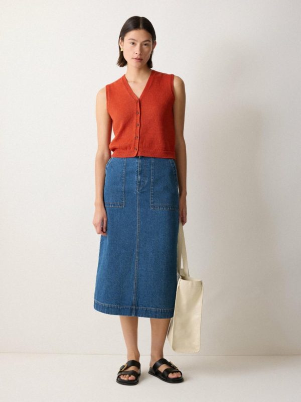 The denim midi we all need, this style is detailed with front patch pockets for a 70s feel and a stitched waistband with a concealed hook and eye fastening. A no-brainer for off-duty days with your favourite tank and a pair of slides.