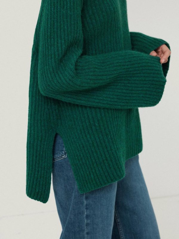 The Faroe knit is our modern take on the classic fisherman jumper, where ribbed merino wool is dramatised with a high roll neck and flared sleeves as a play on proportions. We love the adaptability of the collar as well as its super-soft fabrication for nestling into on colder days.