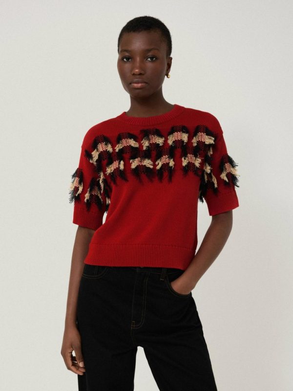 Both folkloric and fiery, this knitted short sleeve top showcases rows of monochrome feathery fringing across the chest for vivacious texture and contrast. Wear with relaxed denim throughout the spring and summer months.