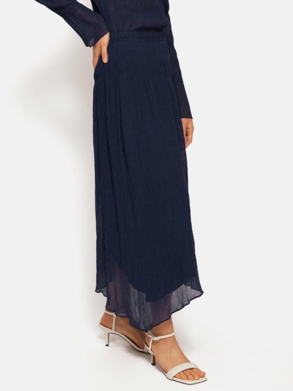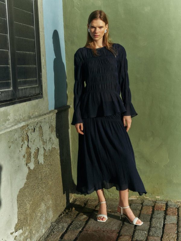 An ethereal midi skirt cut from a crinkle cotton-viscose gauze. Asymmetrical, twin needle stitch smocking creates a beautiful outline. Features an internal stretch waistband decorated with a delicate frill detail. Fully lined with an invisible side zip. Style with matching Gauze Viscose Ruched Shirt to create the most angelic co-ord for summer.