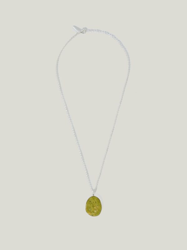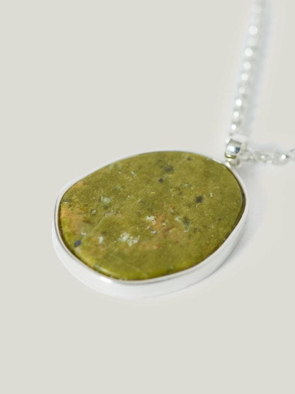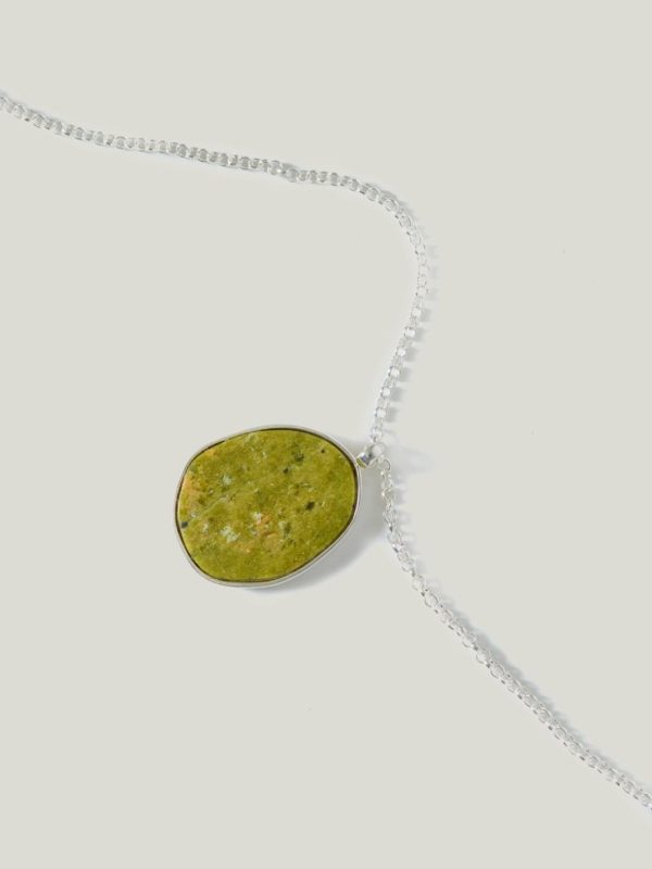 A slice of green jasper brings opulence to this statement pendant necklace. A healing talisman known for its grounding and stabilising properties makes this piece perfect for those who seek inner calm, as well as being loved for its vibrant green tones. Due to the natural properties of the stone, each piece will differ in appearance and colour.