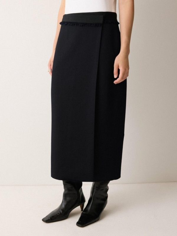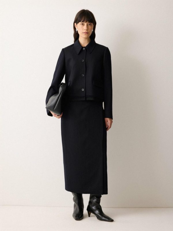 Designed as part of a co-ord, this midi skirt is crafted from the same lustrous wool blend fabrication as the matching jacket, making it perfect for day to nighttime dressing. The wrap front is complemented by a grosgrain trim, which brings a layer of texture to its otherwise sleek silhouette.