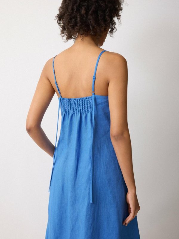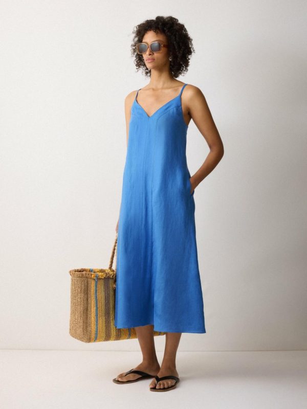 Take to sun, sea and sand in the perfect beach sundress; this maxi is just the ticket, crafted from a sheer, lightweight linen in a panelled design for dramatic lengthening effect. A shirred panel at the back allows for extra comfort throughout the day. A piece that will take you from beach to bar (and back again).