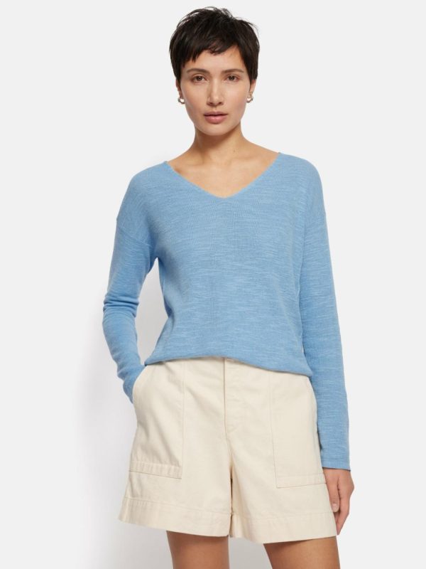 Invest in our fine gauge linen cotton knit V-neck jumper. This simplistic style features tiny rolled knit edges and a fine centre seam detail. Designed with a slim fitting shape, this jumper has a minimal aesthetic and lends itself as the foundation to your transeasonal ensembles.