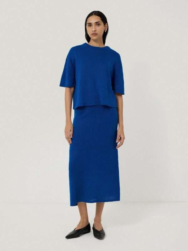 Embrace the art of laid-back, summertime elegance with this breathable linen knitted top. A relaxed, boxy silhouette meets a crew neckline, culminating in a chic yet understated aesthetic, especially when paired with the matching skirt.