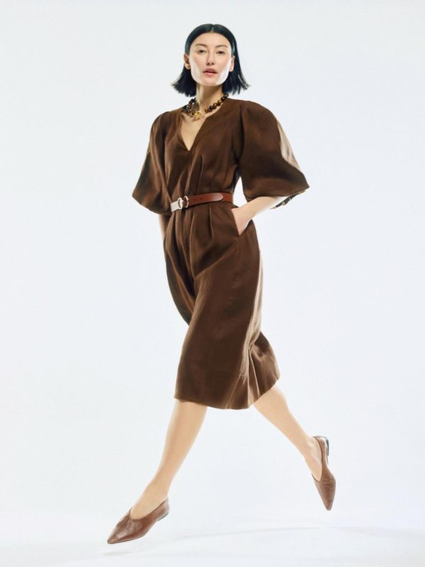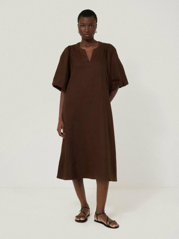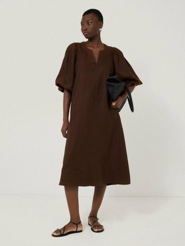 Framed by voluminous puff sleeves gives this midi dress subtle drama for day or evening wear. Airy in a soft, lightweight linen, complete this kaftan style with gold jewellery and a pair of sandals for effortless ease under the sun.