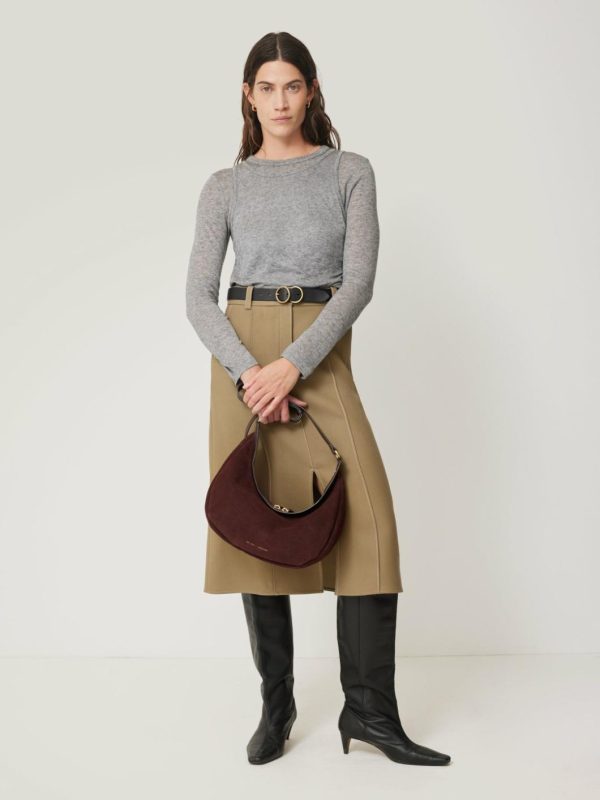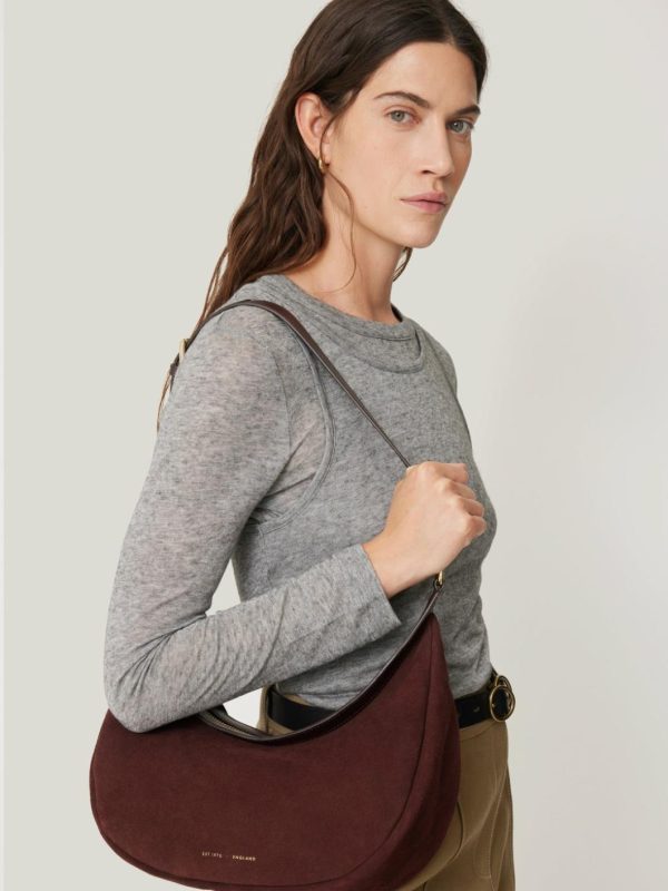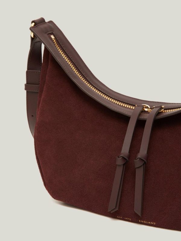 Our classic Melbury shoulder bag has been reimagined in a rich port-coloured suede for the autumn season with contrasting leather trims. The crescent shape features a practical zip top closure for keeping your essentials secure alongside a back pocket for keeping cards at hands reach. The fully adjustable strap also allows for wearing as a shoulder bag or across the body.