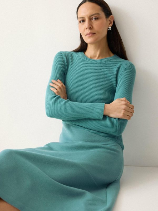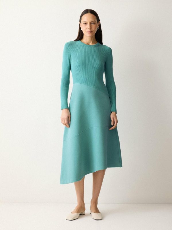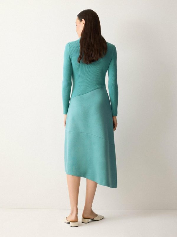 Combining the warmth of a ribbed knit on top with the comfort and softness of jersey cotton on the bottom, this dress will become a versatile addition in your wardrobe. Falling to the calf with an asymmetric hem, toughen the look with a pair of knee high boots or dress up with heels.