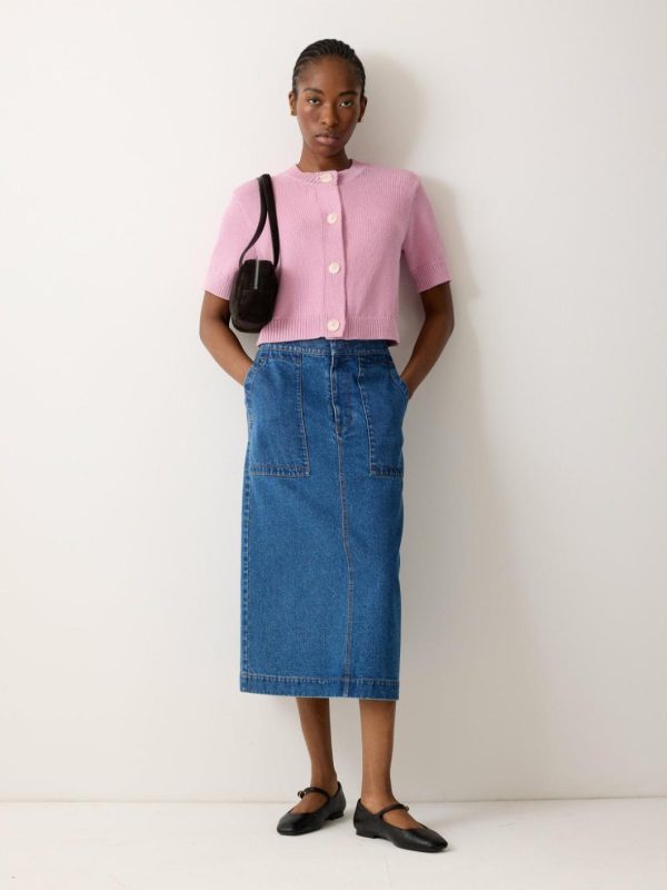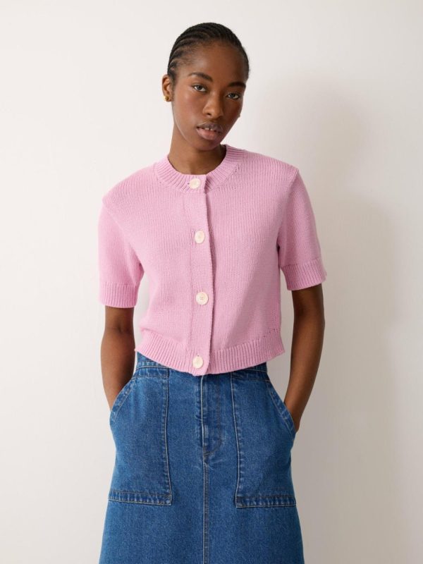 This short sleeve cardigan has a boxy, cropped fit, making it the perfect transitional knit with high-waisted trousers and denim.