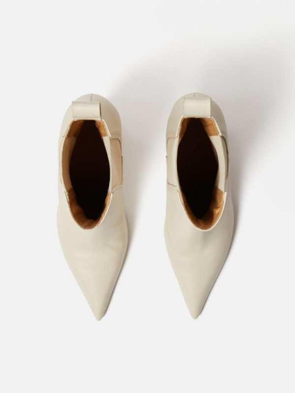 Our elegant Skelter Heeled Boot arrives in smooth cream leather, featuring a pointed toe, stiletto heel underfoot padding and finishes at the calf. For fresh update to your winter wardrobe pair this boot with jeans or dresses to transition your look into spring.Fit and Features