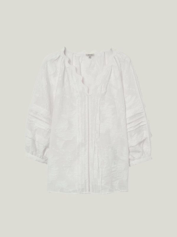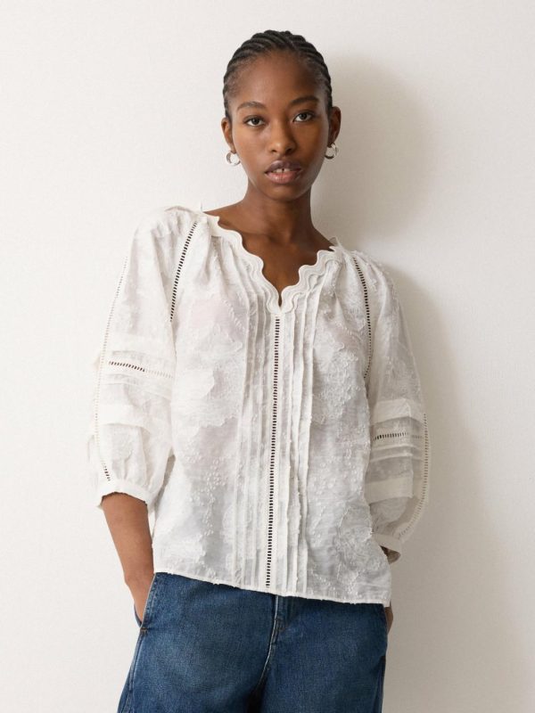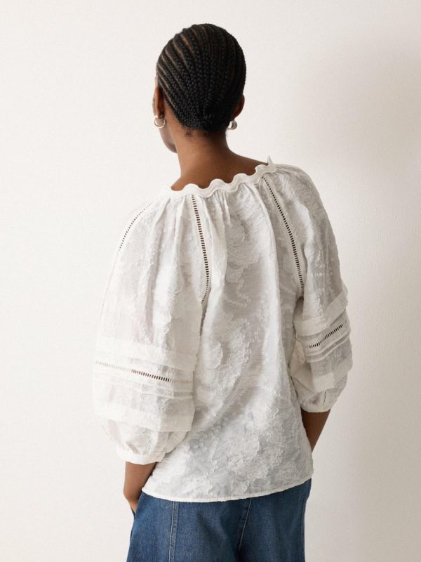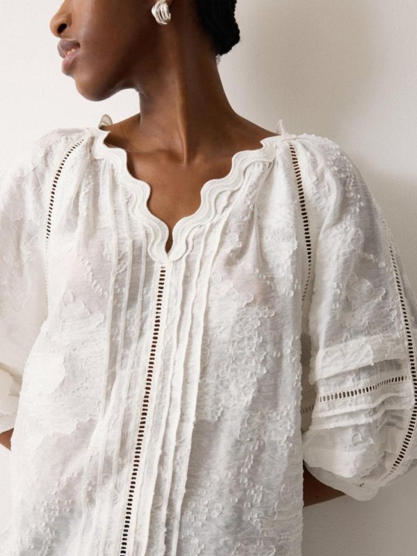 A summer blouse with endless versatility, this wardrobe piece combines volume with playful details. Crafted from a textured jacquard, exaggerated puff sleeves are detailed with beautiful pintucks, while a scallop trim lends a charming vintage-inspired feel.