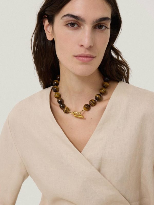 This season, a spotlight on semi-precious stones gives way to boho-inspired jewellery. Included is this statement necklace, where a row of chunky tiger’s eye beads are met with a contemporary 14ct gold-plated T-bar fastening.