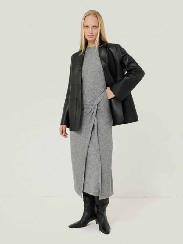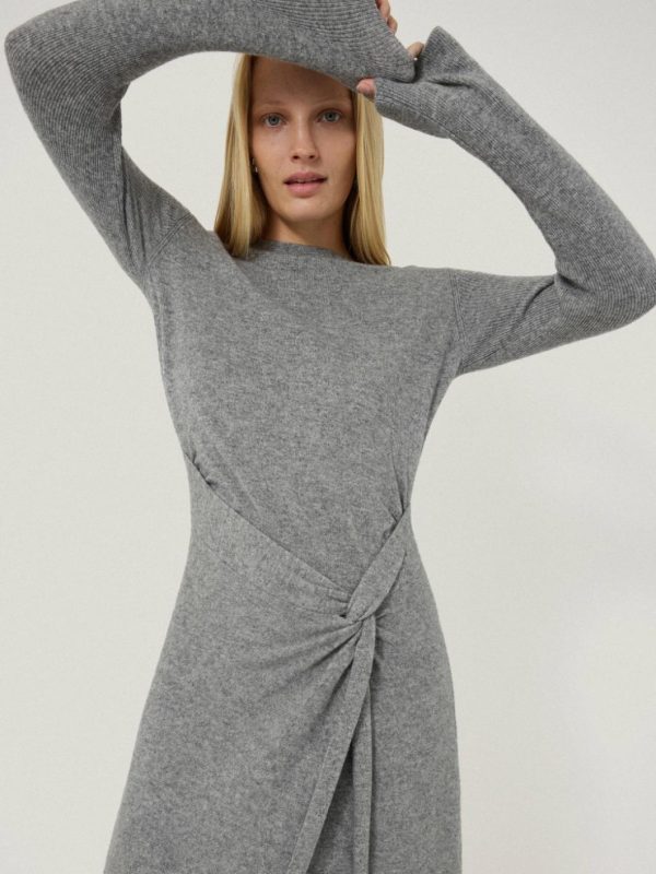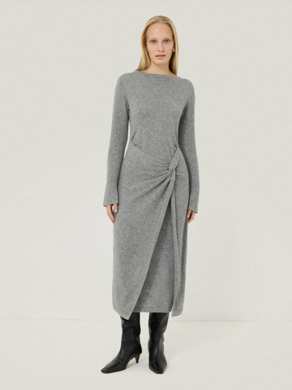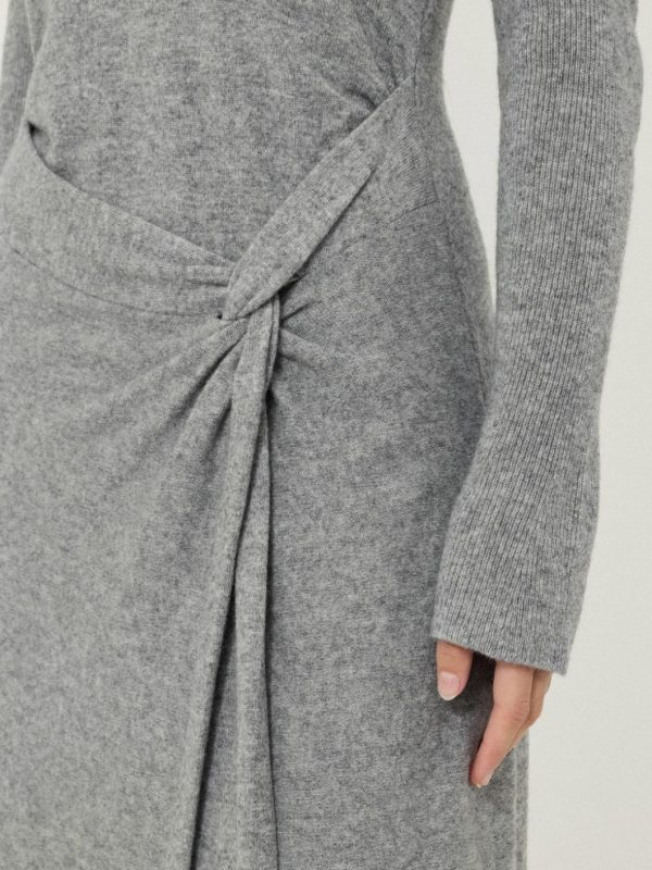 Sumptuous and cosy in a blend of wool and cashmere, this grey marl dress puts a contemporary twist (literally) on daytime dressing, where a knotted side creates a subtle cinched-in silhouette with a beautifully hanging skirt. The perfect piece to feel wrapped up in a functional and beautiful way.
