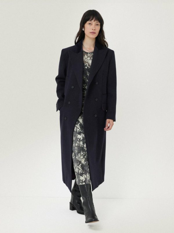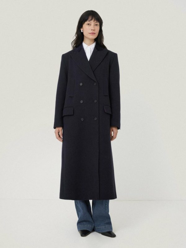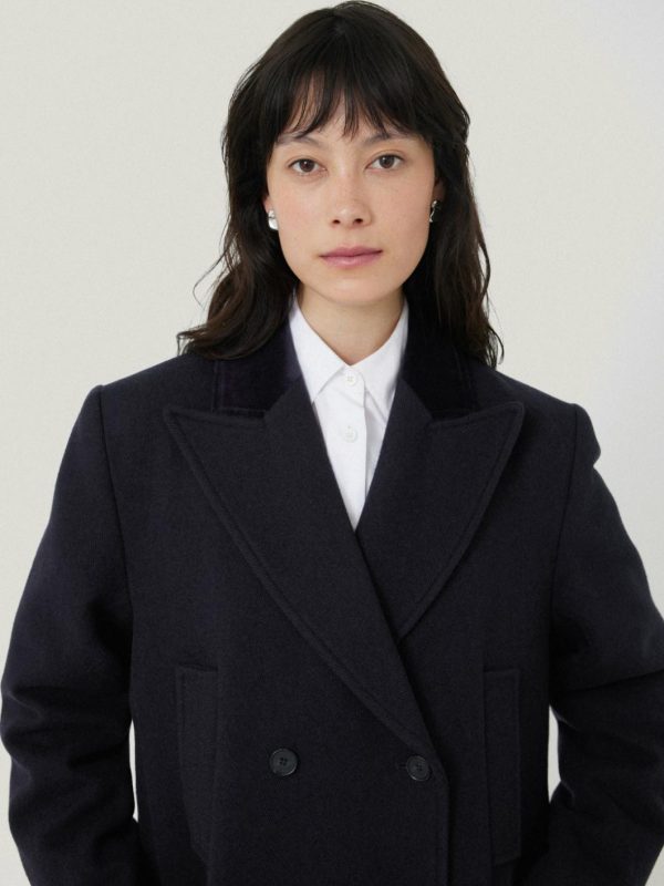 This coat echoes classic mens tailoring with a playful Jigsaw twist. Crisp shoulders and a double-breasted front define the structured silhouette with contrasting velvet lapels. Crafted from Italian wool with a herringbone stripe throughout, we love this forever coat for its enduring power over any cold weather ensemble.