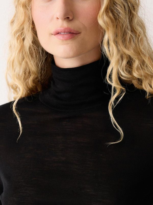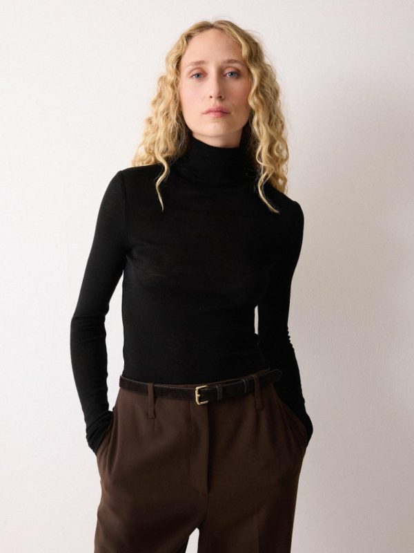 Knitted from pure merino wool, this subtly ribbed polo neck sweater is the perfect lightweight underpinning for the season ahead. It features long, slim sleeves with a turtle neck that can be worn, folded, unfolded or scrunched up. Semi-sheer, layer under tailoring or dresses to cold-proof your outfit or add a pop of interest.