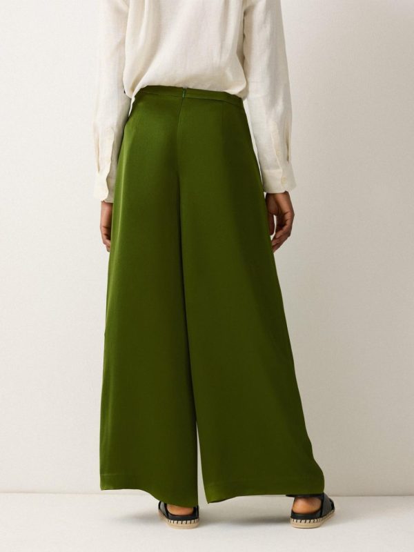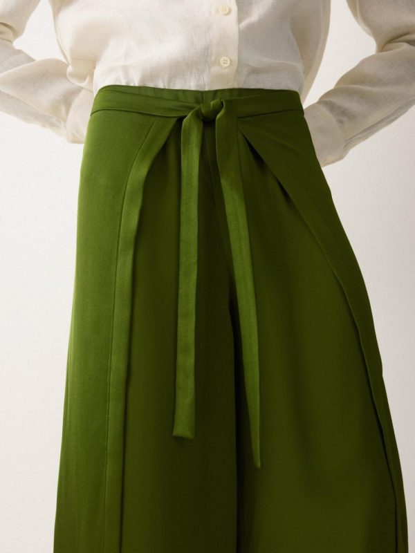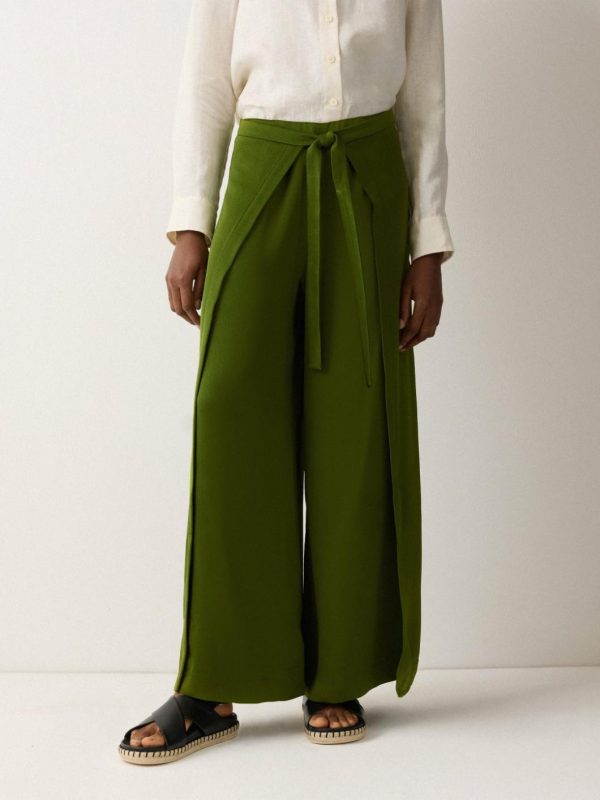Echoing our Modern Shibori trouser silhouette in a luscious shade of green, these wrap trousers give the illusion of a wrap skirt around the waist with a self-tie front. Their fluid fabrication and wide leg shape makes them the perfect choice for relaxed summer days and evenings with a plain white shirt.